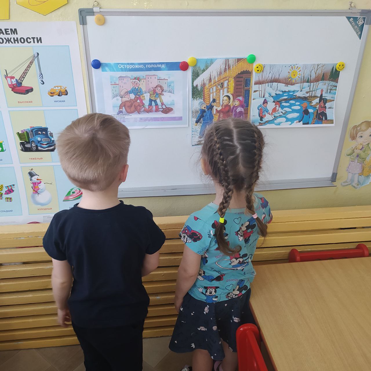 Рассмотрели сюжетные картинки про сосульки.Воспитатель напомнила детям что не нужно кушать сосульки – можно заболеть, не нужно сбивать сосульки и, и стоять над висящими сосульками, чтобы они не упали нам на голову и мы не получили травму.