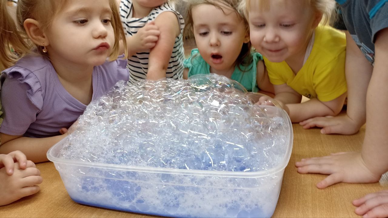 Воспитатель показала малышам «волшебные пузыри». Этот эксперимент привел детей в восторг. Для них – научное явление — чудо и необыкновенное представление.