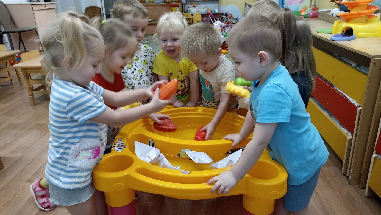 Познакомились со свойствами воды и экспериментальным путем выяснили, что тяжелые предметы тонут, а легкие — плавают. Малыши учились высказывать предположения, делать выводы и обследовать предметы.