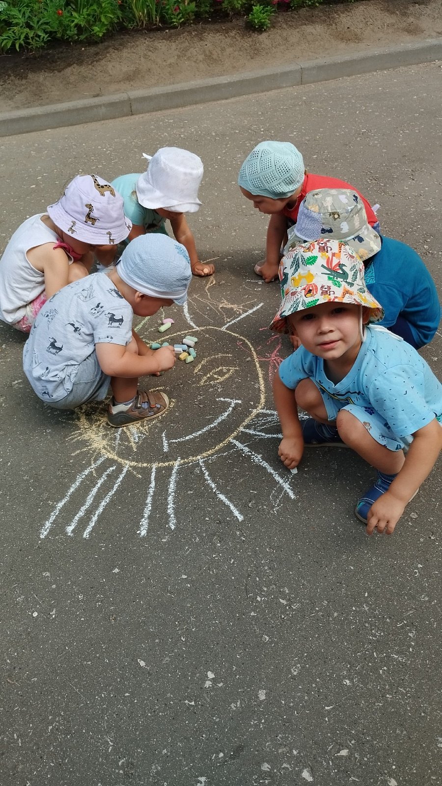 ☀Воспитанники с энтузиазмом взялись за разноцветные мелки и уже через несколько минут асфальт заиграл яркими красками.