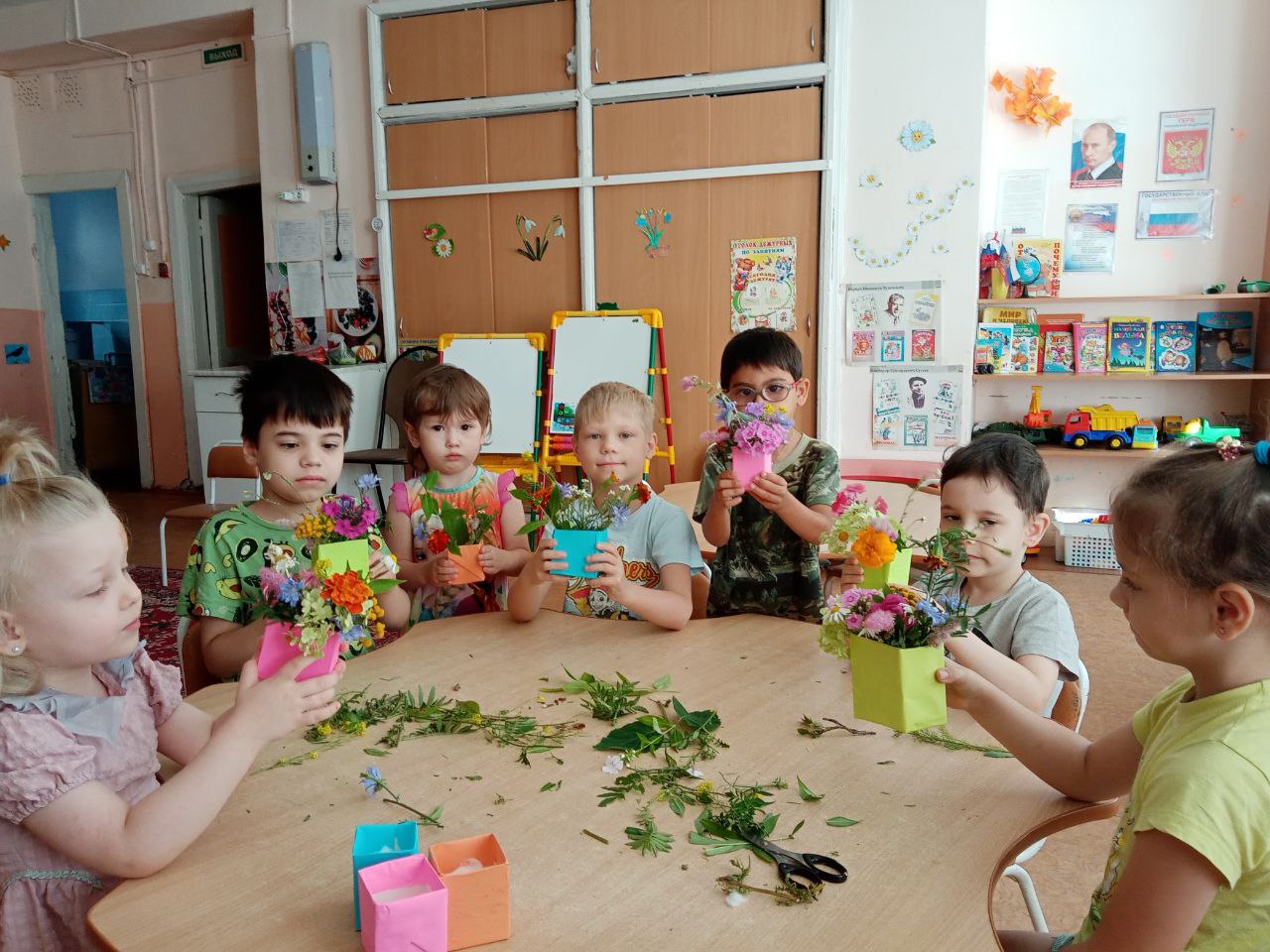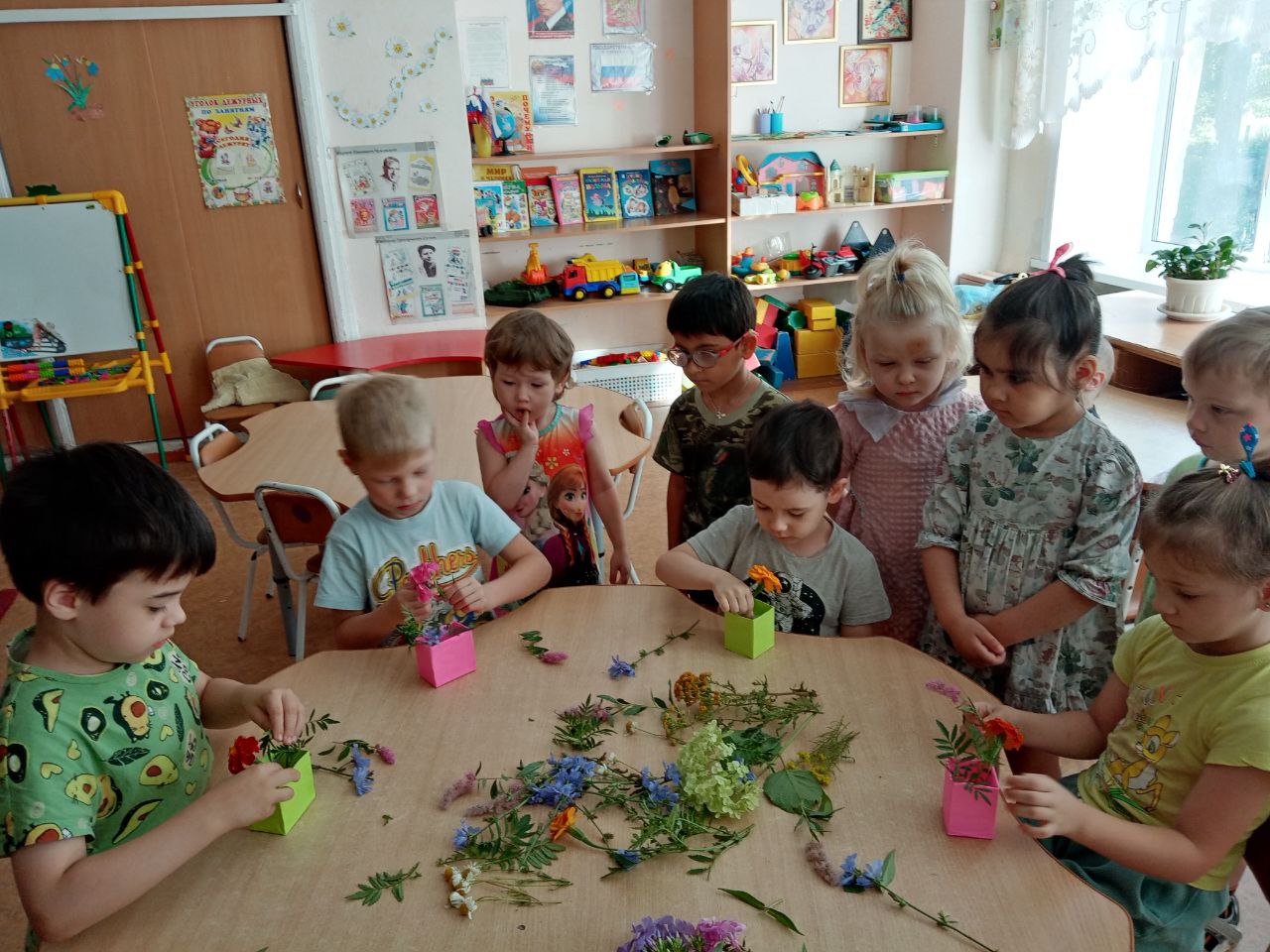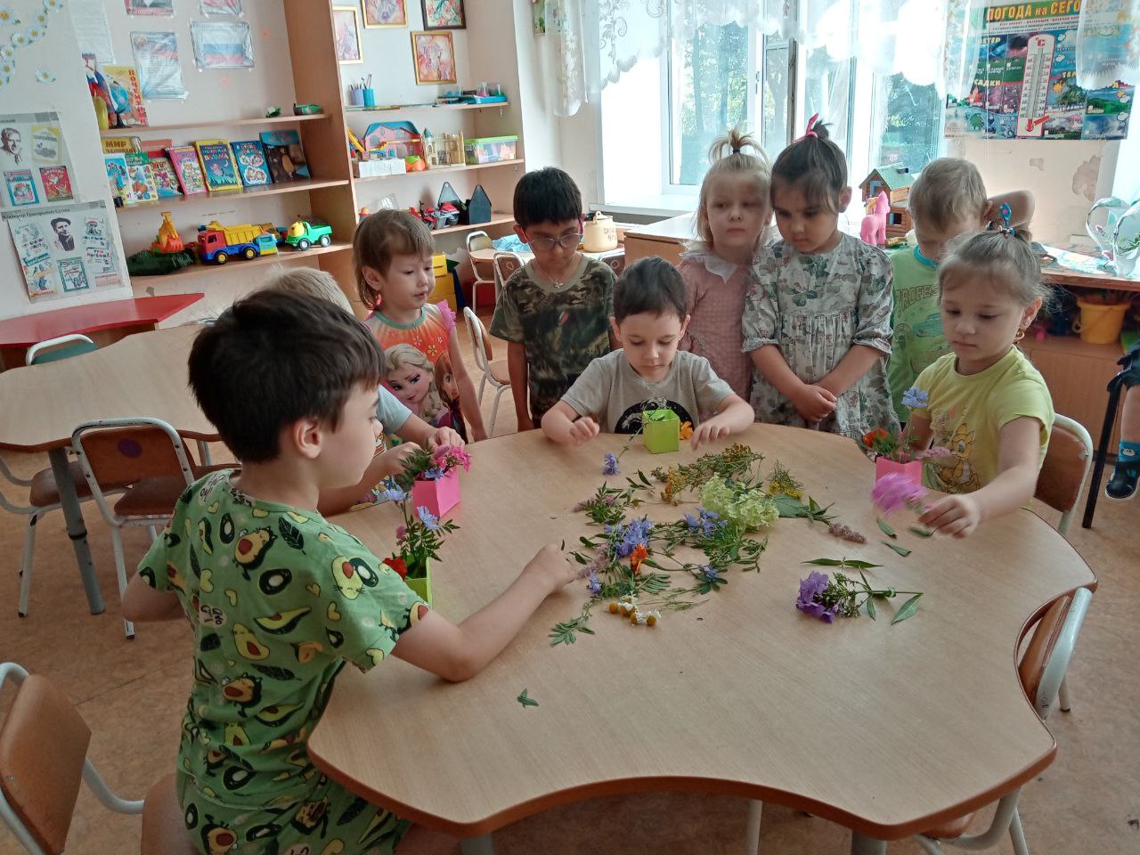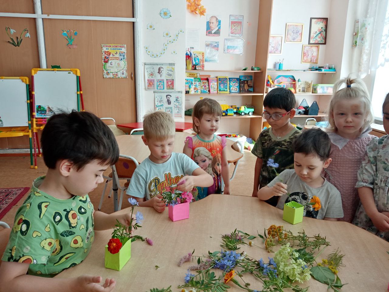 Мальчики и девочки тоже попробовали себя в роли флористов. Тем более, что летнее изобилие растительности даёт большой простор для фантазии и возможность придумать разные варианты композиций. Ребята сами выбирали природный материал: цветы, листья, травы, веточки, плоды деревьев и кустарников, ягоды. Из всего этого флористического разнообразия получились интересные композиции и цветочные букеты, которые стали украшением группы.